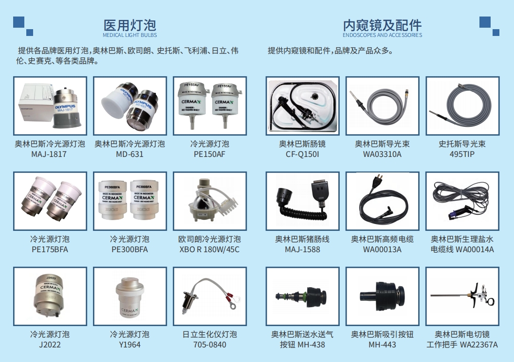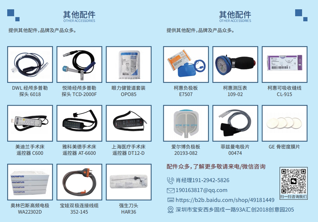 主營產品包含:監護類、除顫類、 呼吸麻醉類、內窺鏡類及其它原裝產品;主要為第三方維保公司、各經銷 商及醫院提供一站式的醫療配件耗材供應,與國藥、柯渡、醫工等都有長 期合作。 公司以“提供醫療配件整體解決方案”為發展方向;以“用心滿足客 戶需求,優化原裝產品價格”為宗旨;以“合作、共贏、創新、發展”為 企業文化基石;始終嚴格要求團隊,拙誠致遠,穩中求進!