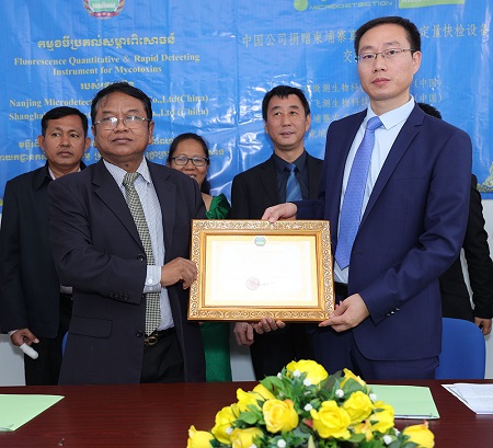 2019年12月5日,在中國農業農村部專家、中國駐柬埔寨使領館參贊、柬埔寨農林漁業部官員及專家的見證下,在柬埔寨農林漁業局檢測中心舉行了上海飛測生物科技有限公司(南京微測全資子公司)真菌毒素快速檢測箱的捐贈儀式,并進行了相關的技術交流和培訓,簽訂了相關合作協議,為雙方以后的深入合作奠定了良好的基礎。