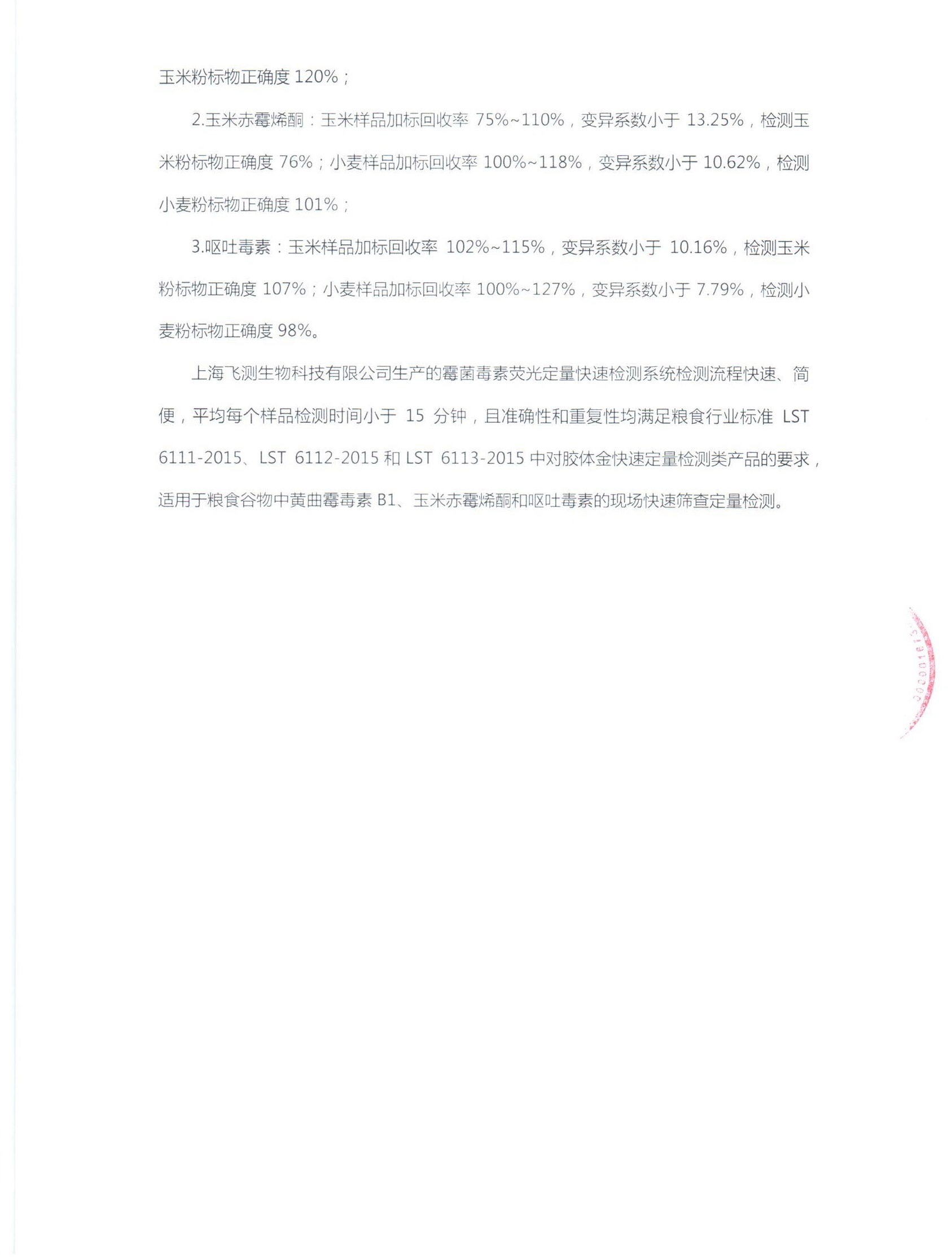 2017年7月,由我司自主研發的霉菌毒素熒光定量檢測系統,以其優異的產品性能,圓滿通過國家糧食局科學研究院權威驗證,成為國內首家通過該權威認證的的霉菌毒素快速定量檢測產品,對標糧食行業標準LST6111-2015、LST6112-2015和LST6113-2015,打破國外產品在這一領域的長期壟斷。上海飛測霉菌毒素熒光定量快速檢測系統,僅需8分鐘準確定量測定糧油、谷物、飼料中霉菌毒素毒素的含量,目前已在五得利、益海嘉里、光明飼料集團等大型糧油飼料加工企業使用。